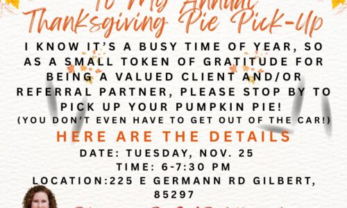 Stop by and pick up your free pumpkin pie and let me wish you a Happy Thanksgiving! 225 E. Germann Rd. Gilbert, AZ 85297 November 25, 2025 6-7:30PM … Read More about Thanksgiving Pie Event- Client Appreciation